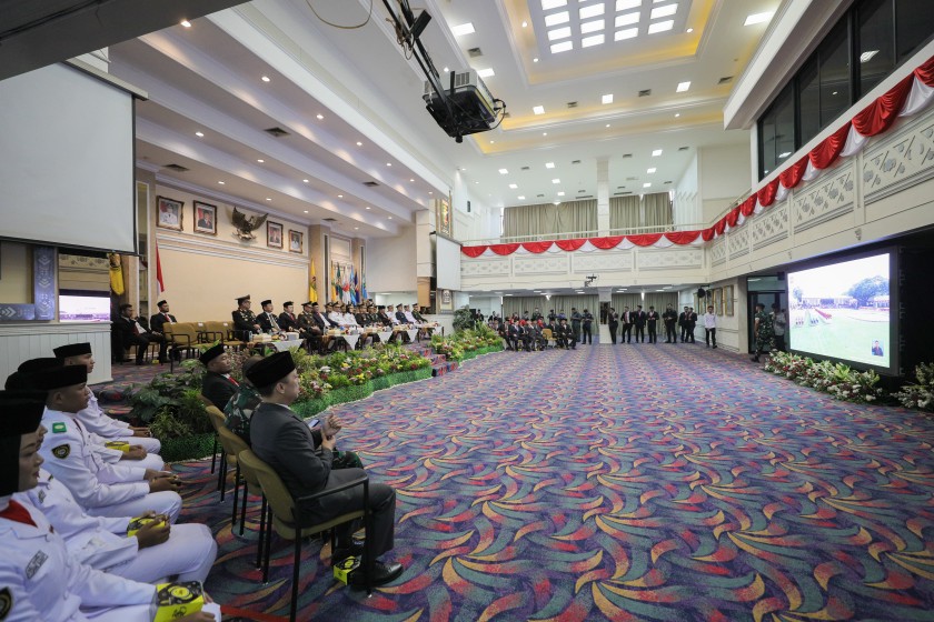 Bandar Lampung – Usai mengikuti upacara peringatan Hari Ulang Tahun (HUT) ke-80 Kemerdekaan Republik Indonesia di Lapangan KORPRI, Gubernur Lampung, Rahmat Mirzani Djausal bersama Wakil Gubernur, Jihan Nurlela melanjutkan agenda dengan menyaksikan siaran langsung Detik-Detik Proklamasi dari Istana Negara secara virtual di Balai Keratun, Lantai 3, Minggu (17/8/2025).